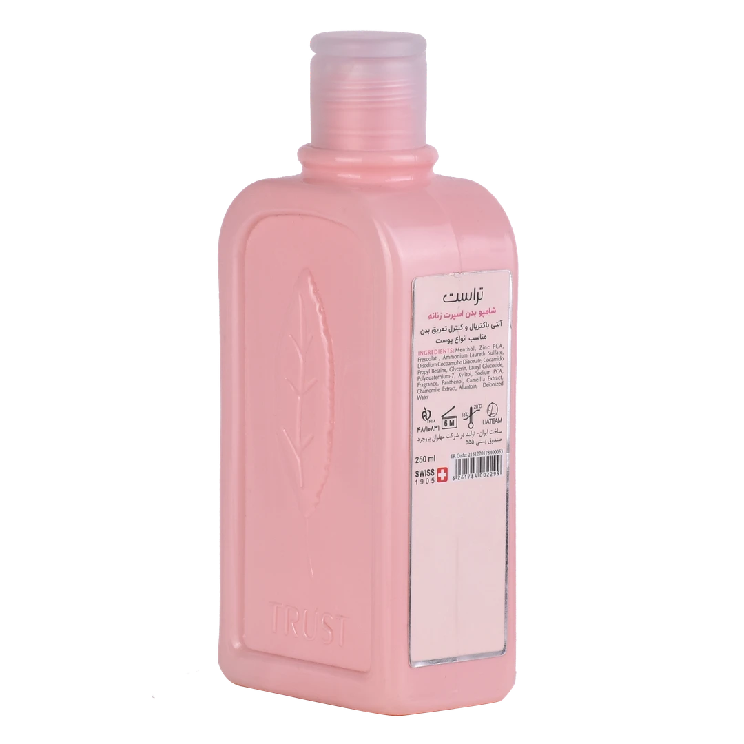 شامپو بدن اسپرت زنانه تراست، با داشتن منتول و زینک PCA در ترکیباتش، میزان تعرق را کنترل کرده و از تکثیر باکتریها روی پوست جلوگیری میکند. همچنین این محصول باعث حس خنکی و طراوت روی پوست شده و رایحهی مطبوعی روی آن ایجاد میکند. این محصول گزینه مناسبی برای استحمام بعد از ورزش است.