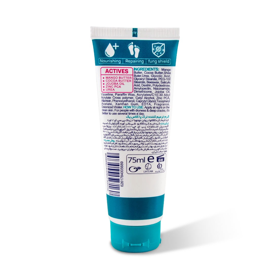 با ایجاد ترک ها در کف پا، فرد موقع ایستادن در این ناحیه احساس درد و ناراحتی کرده و پوست در این قسمت دچار پوسته ریزی، قرمزی و تورم می شود. پوست پا در این حالت مستعد انواع عفونت ها از جمله عفونت های قارچی است. بنابراین برای بهبود ترک های کف پا می بایست از محصولات مراقبتی و کمکی برای رفع و بهبود ترک های پا استفاده کرد. کرم ترمیم کننده ترک پا کلاس یک حاوی ترکیبات فعالی است که سلول های مرده ناحیه کف پا را با لایه برداری ملایم از بین برده و با آبرسانی به پوست در این ناحیه، از خشکی پوست در این ناحیه جلوگیری می کند. همچنین این محصول حاوی چند نوع کره گیاهی می باشد که وظیفه ترمیم و نرم کردن پوست را بر عهده دارد. ترکیبات ضد قارچی و ضد التهاب موجود در محصول از عفونت های قارچی در ناحیه پا جلوگیری کرده و به حفظ سلامت پاها کمک می کند.