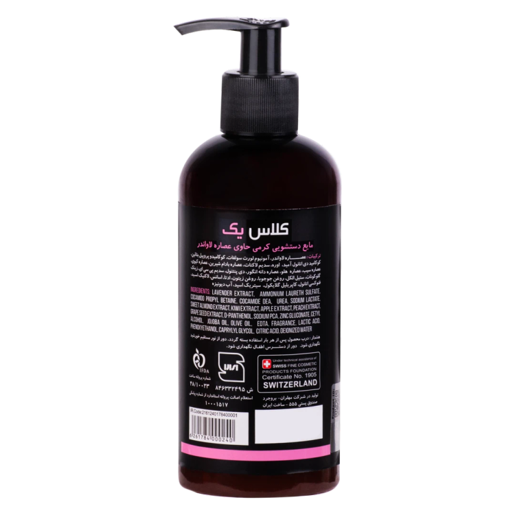 مایع دستشویی کرمی کلاس یک حاوی عصاره لاواندر، با شستشوی ملایم و عمیق پوست، تمام آلودگیها را از دستها پاک کرده و آن را تمیز و تغذیه میکند. همچنین این محصول با دارا بودن عصاره لاواندر از پیری پوست جلوگیری کرده و التهابات پوستی را تسکین میدهد. علاوهبر این، از پوسته پوسته شدن پیشگیری کرده و پوست را مرطوب میکند. مصرف این محصول، به روشن شدن پوست کمک میکند.